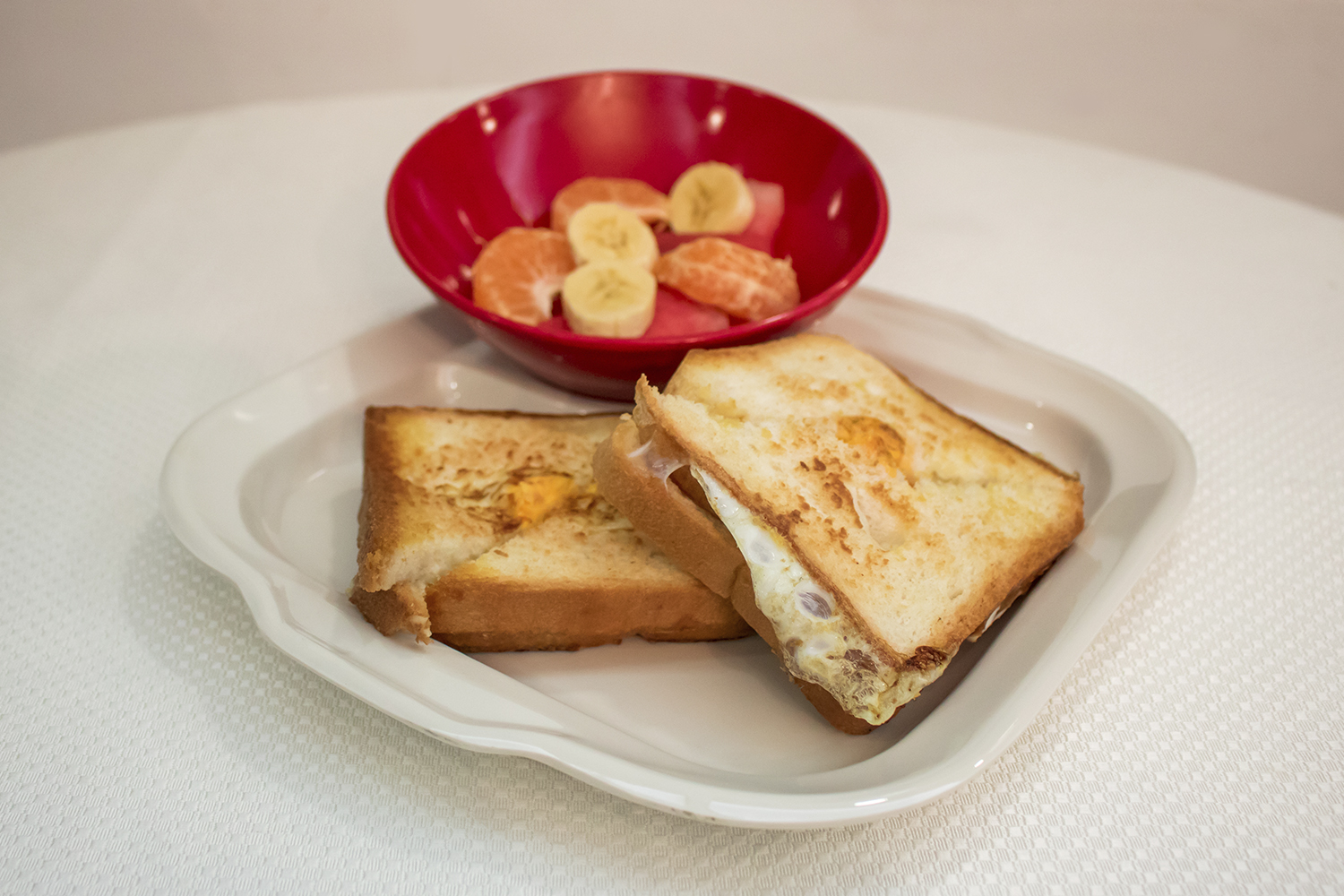 DOS HUEVOS ESTRELLADOS DENTRO DE PAN BLANCO, ACOMPAÑADO DE FRUTA FRESCA DEL DÍA. INCLUYE CAFÉ, MOSH Y PANITOS.