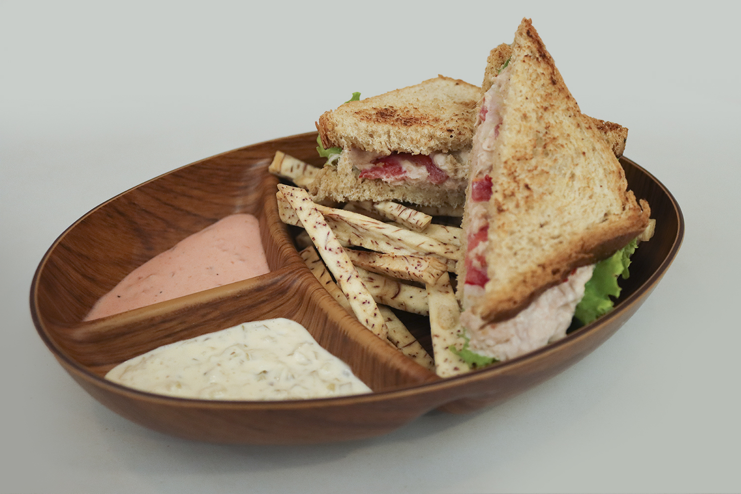 PAN INTEGRAL RELLENO DE POLLO CON CILANDRO, RETOÑO DE ALFALFA Y QUESO MOTZ, CON MALANGUINAS
