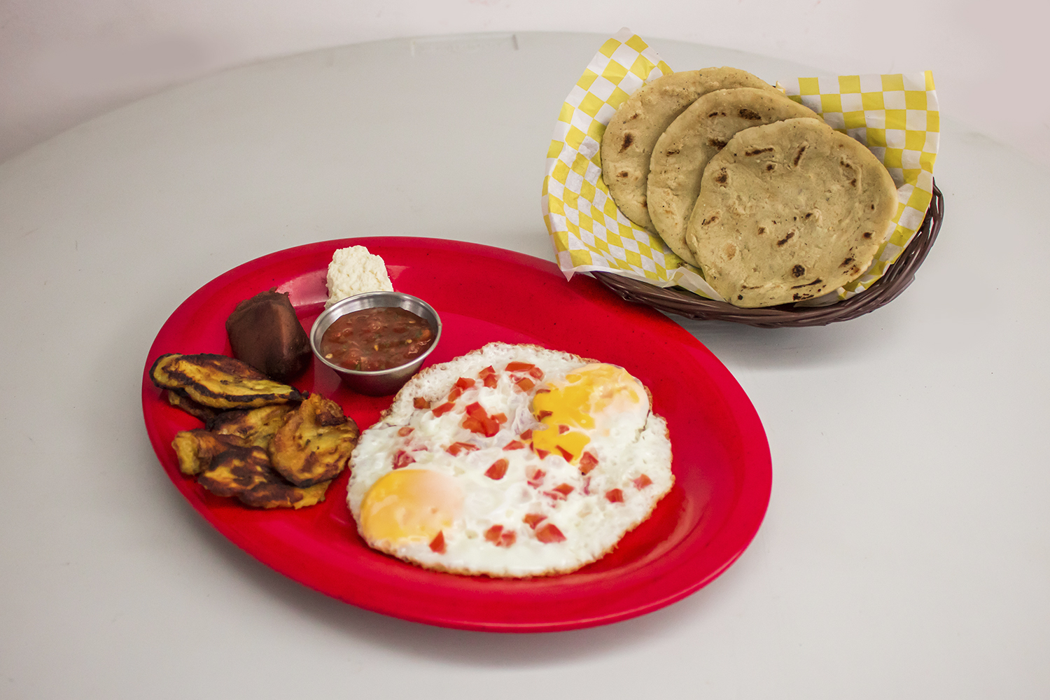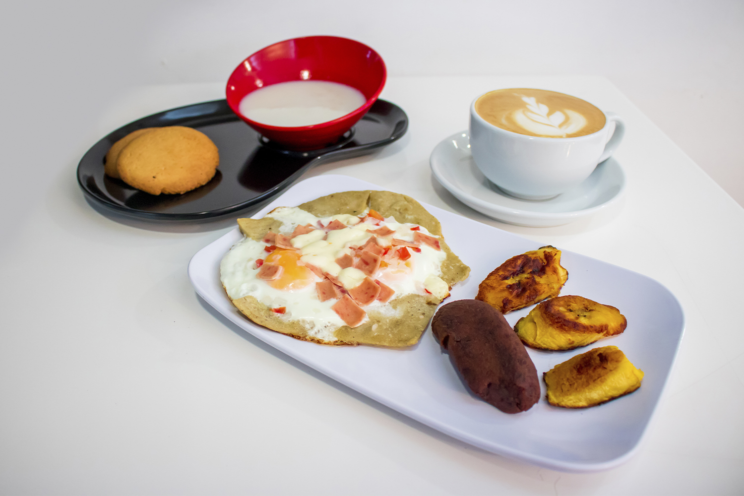 FRITANGA; TORTILLAS CON HUEVO Y TOMATE, CEBOLLA, JAMON Y QUEASO FRESCO, ACOMPAÑADO DE FRIJOLES Y PLÁTANOS. INCLUYE CAFÉ, MOSH Y PANITOS.