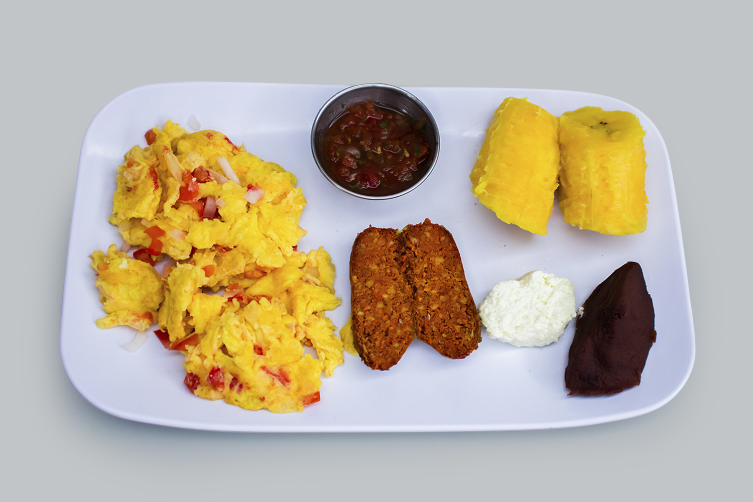 DESAYUNO VIAJERO INCLUYE, HUEVOS REVUELTOS O ESTRELLADOS CON TOMATE Y CEBOLLA, FRIJOL, QUESO, PLATANO, CHIRMOL, TORTILLA, CAFE, AVENA Y PAN