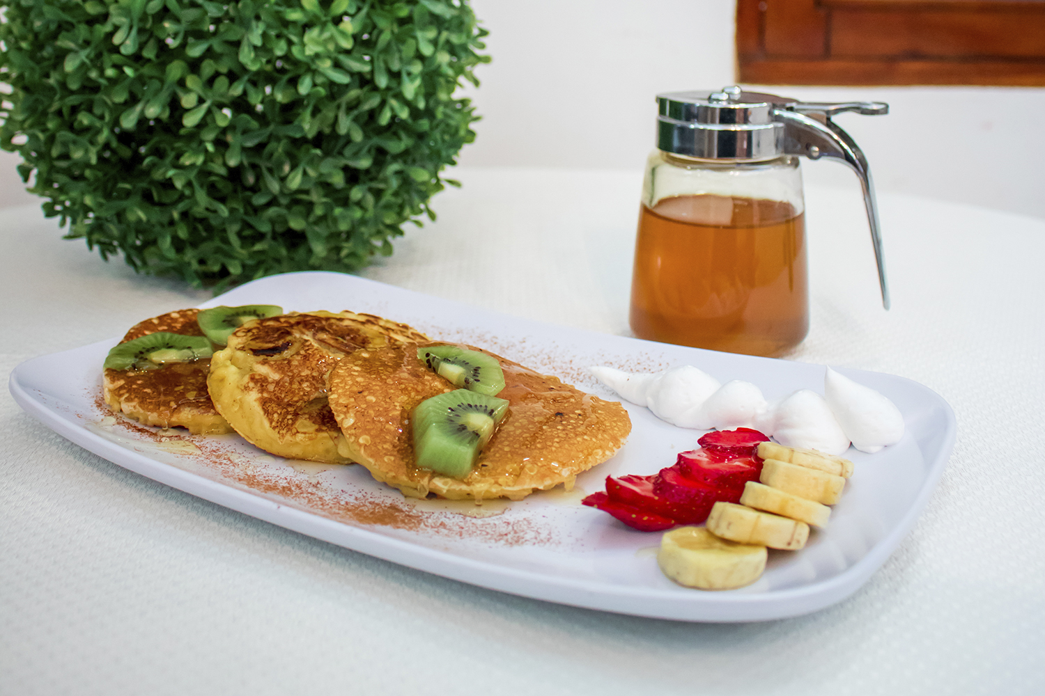 TRES PANQUEQUES RELLENOS DE BANANO Y FRESA, ACOMPAÑADO DE CREMA BATIDA , FRUTA, MIEL Ó CHOCOLATE. INCLUYE CAFÉ, MOSH Y PANITOS.